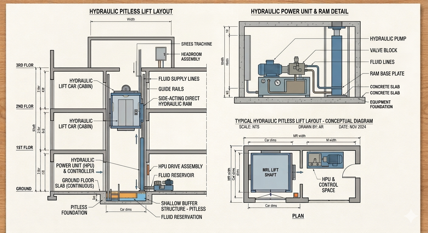 A hydraulic pitless lift is a type of elevator that operates using a hydraulic system (oil pressure and piston) but does not require a deep pit at the bottom of the shaft.